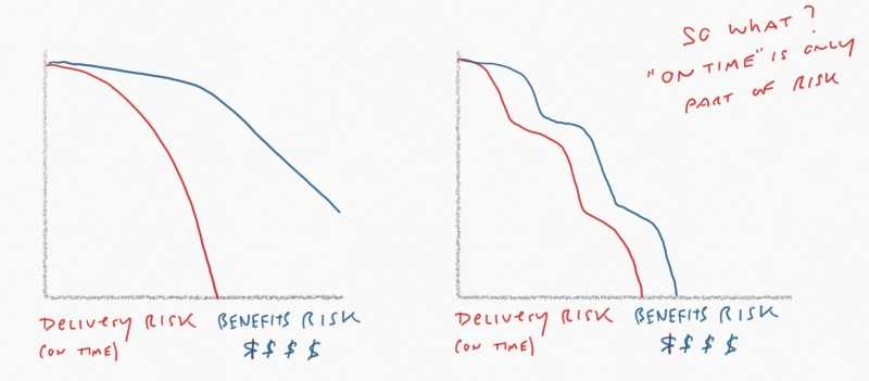 So much effort is spent reducing what I call “delivery risk”. This makes sense if you deliver custom projects and the customer pays cash-on-delivery. In SaaS (software as a service), we don’t get paid when we deliver the work. The benefits accrue over time. I call this “benefits risk” (the risk the work will be a dud).