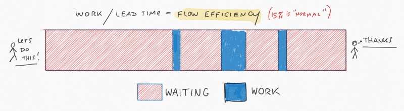 First, if we look at lead time — the time from when we dream up an idea, until it reaches customers — you’ll notice that most of the time is spent “waiting”. 15% flow efficiency (work time / lead time) is normal. Crazy, right? Yet we focus on what’s (relatively) visible…the small amount of time spent actually doing the job. The best companies hit 40%. Short story, to go faster, you need to address the waiting time.