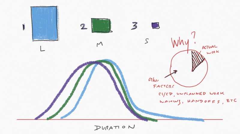 This is a fun trick. Plot the time-to-completion for your large, medium, and small work items. Try to move up a level and focus on items of actual customer value (not tasks). What you’ll notice in many organizations is that the “size” of the work has no bearing on the time-to-completion. Why? There are too many other factors influencing how long it takes to complete the work (e.g. dependencies, unplanned work, lots of work in progress, etc.).
