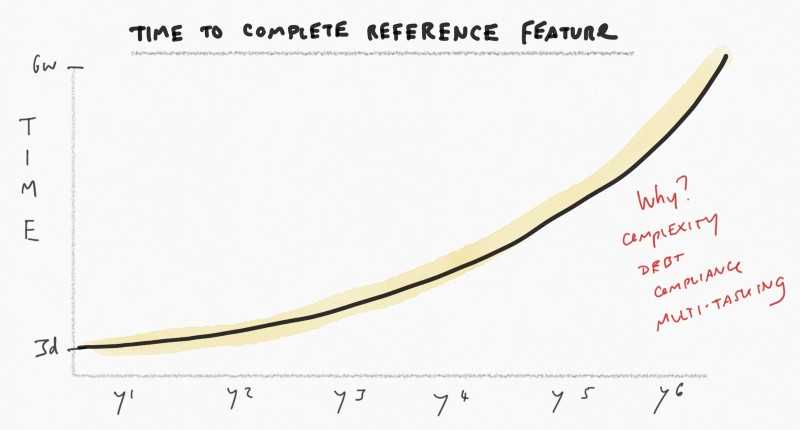 And finally. Take a well understood reference feature and pass it through your product development system. Without managing complexity / refactoring / automation, it will take longer to complete this feature each year. Even if your team remains the exact same. Having something go from 3 days to 6 weeks is not unheard of.